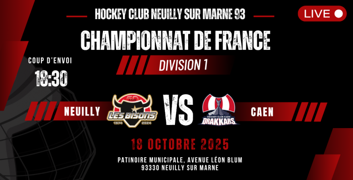 Pour la 3ème journée du Championnat de France de la saison 2025-2026, ce samedi 18 octobre les Bisons confronteront les Drakars de Caen à 18h30 à la patinoire de Neuilly.