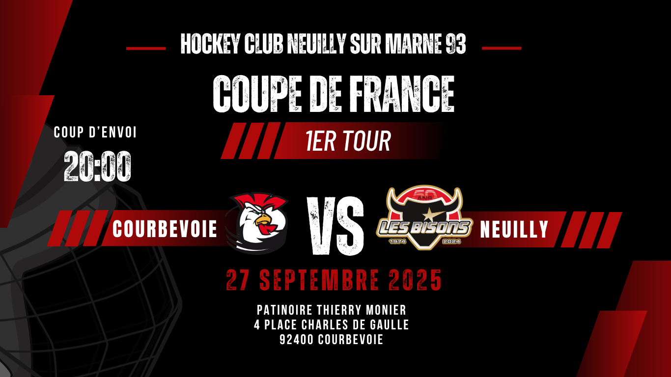 Home Equipes Division 1 Coupe de France – 1er tour Coupe de France – 1er tour 27 septembre 2025 Pour le 1er tour de la Coupe de France et premier match officiel de la saison, les Bisons se déplacent à Courbevoie pour rencontrer l’équipe des Coqs à 19h30 Vous pouvez suivre le score ici