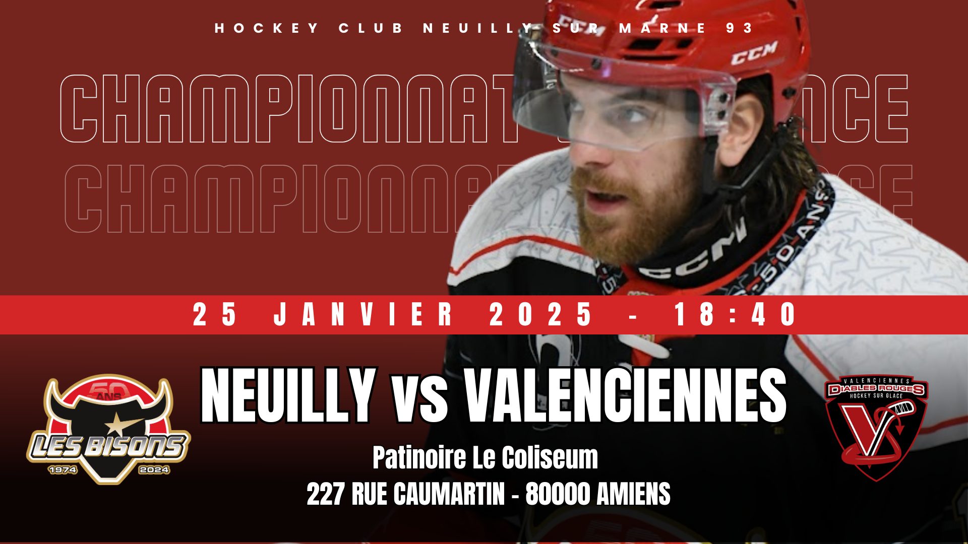En attendant la réouverture de la patinoire de Neuilly, Les Bisons et les Diables Rouges de Valenciennes se rencontrent pour la 21e journée du championnat de France à la patinoire d’Amiens le samedi 25 janvier 2025 à 18h40.