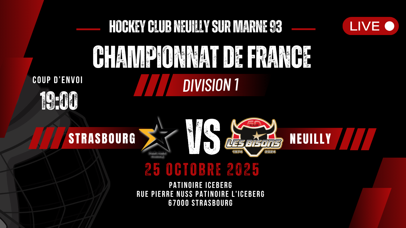 Home News D1 – J4 Strasbourg vs Neuilly D1 – J4 Strasbourg vs Neuilly 19 octobre 2025 Pour la 4e journée du championnat de France, Les Bisons se déplaceront pour rencontrer L’Etoile Noire de Strasbourg le 25 octobre à 19H00. Vous pouvez regarder le match en live dès 18h55 via HOCKEYFRANCE.TV Ou suivre le score ici